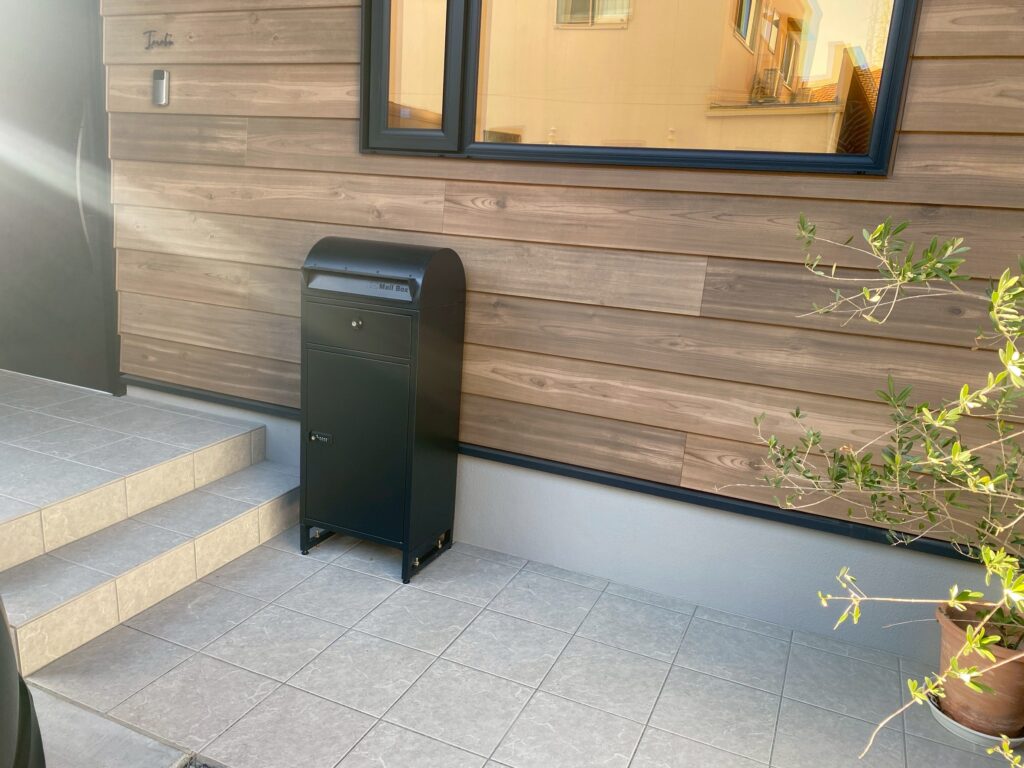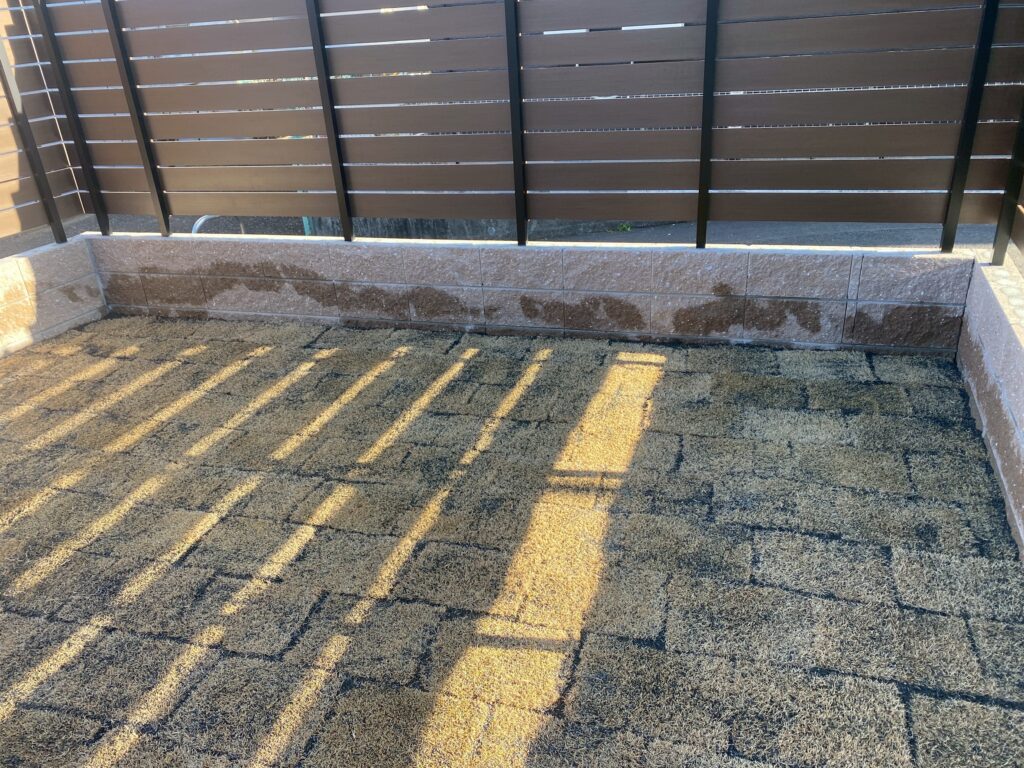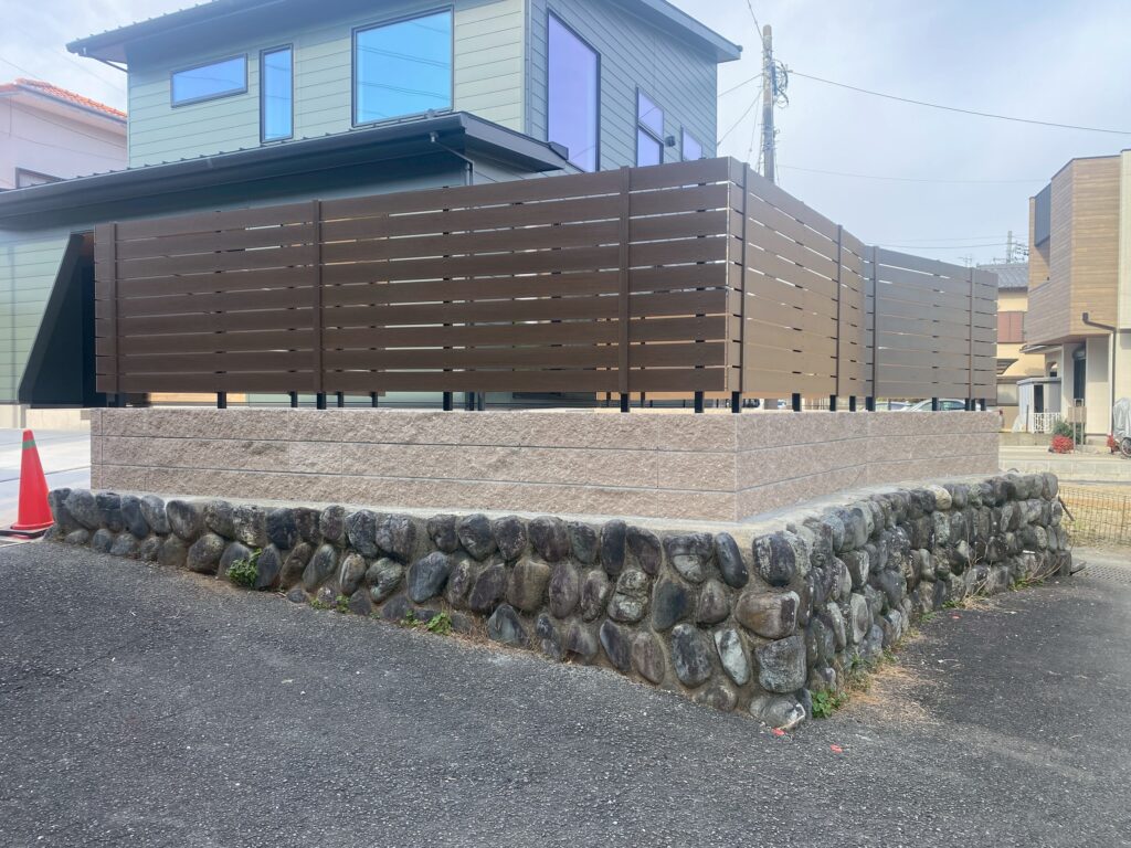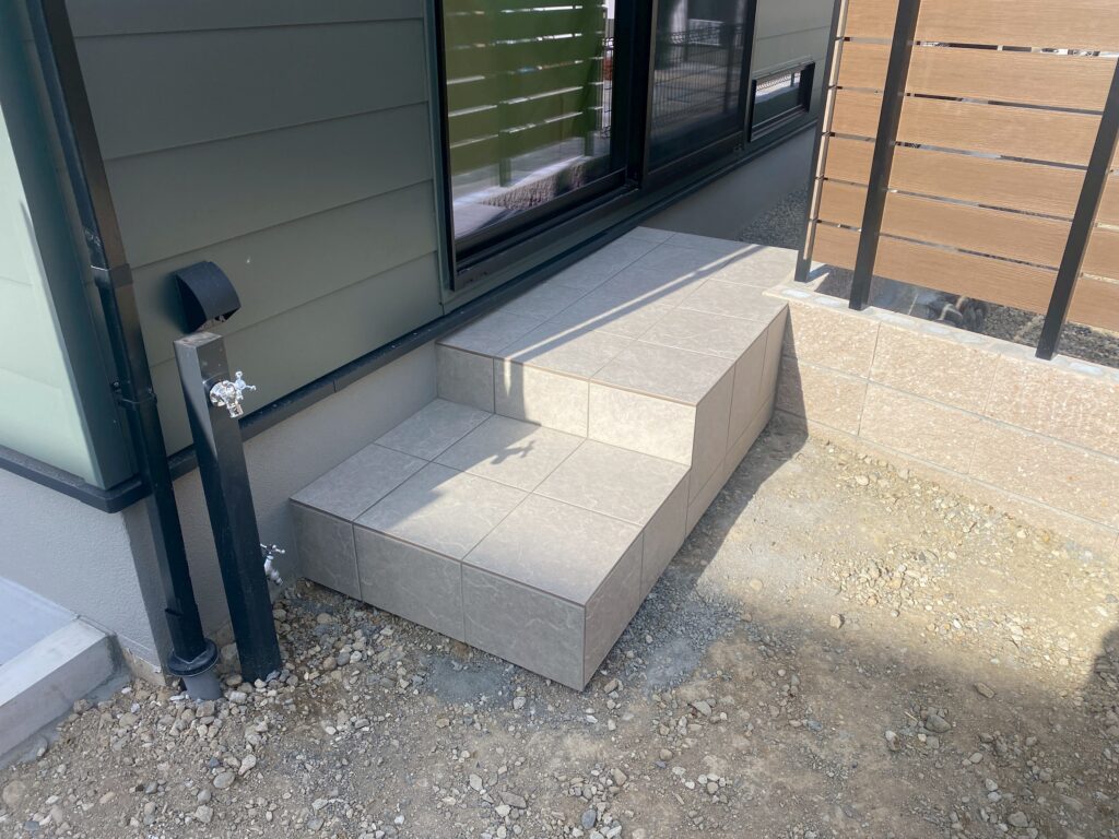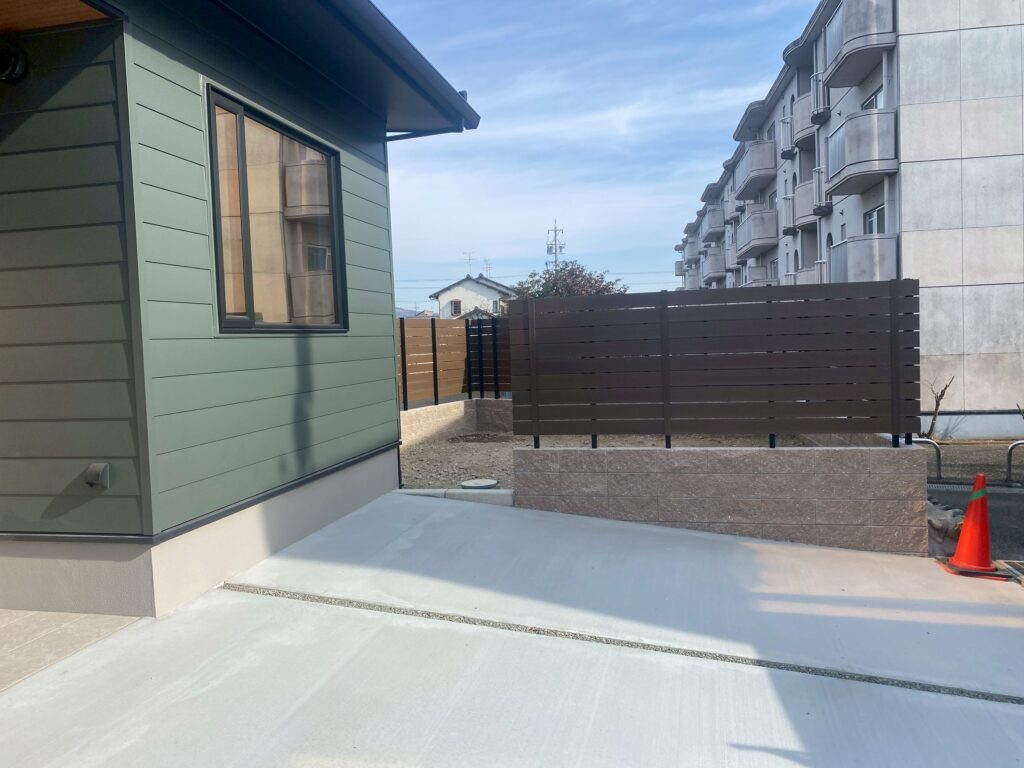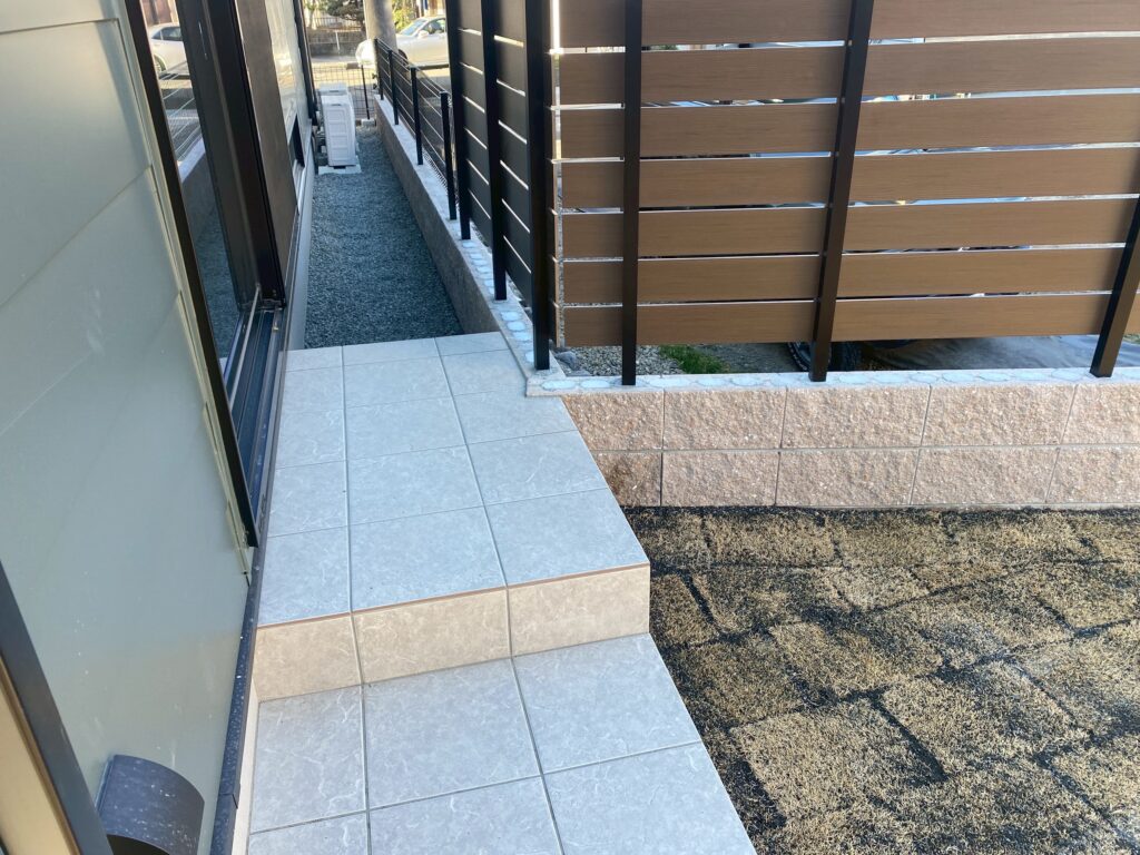 内容的には駐車場の土間打ち3台分とお庭に目隠しフェンス1200Hをブロックを積んで設置し視線が気にならない場所はメッシュフェンスで高さも下げました。立水栓も標準的な物から2口のお洒落な物に交換しました。あとは掃き出しからお庭への出入りの為のタイルデッキと芝張りを行い最後に宅配ボックスを設置して完了となりました。芝生が一部貼れていないのは、今後のシンボルツリーを春先に終える為です。何とかT様のご希望する外構工事が出来ました事御礼申し上げます。